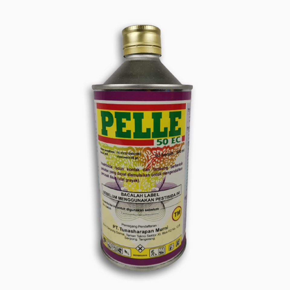 PELLE 50 EC adalah insektisida racun kontak dan lambung untuk mengendalikan hama pada tanaman cabai ulat grayak Spodoptera litura, tanaman kedelai ulat grayak Spodoptera litura, dan kakao penggerek buah kakao Conopomorpha cramerella.